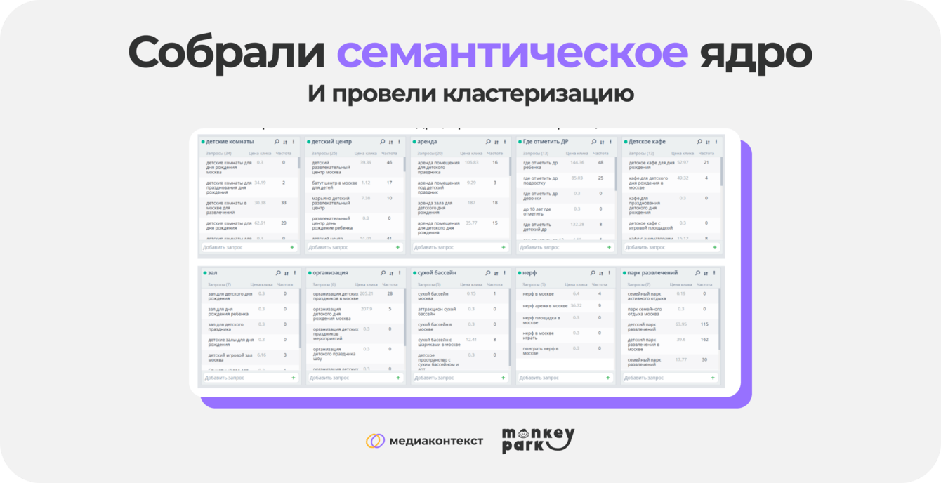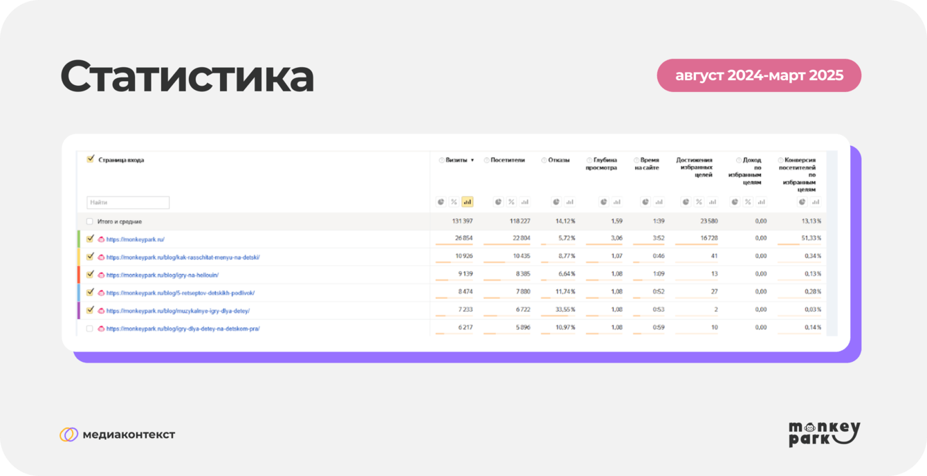 В апреле 2025 г. на поисковое продвижение в «Медиаконтекст» пришел детский развлекательный центр в Москве. Запрос клиента был не только на стандартные SEO-работы, но также на написание информационных статей в Блог на сайте.