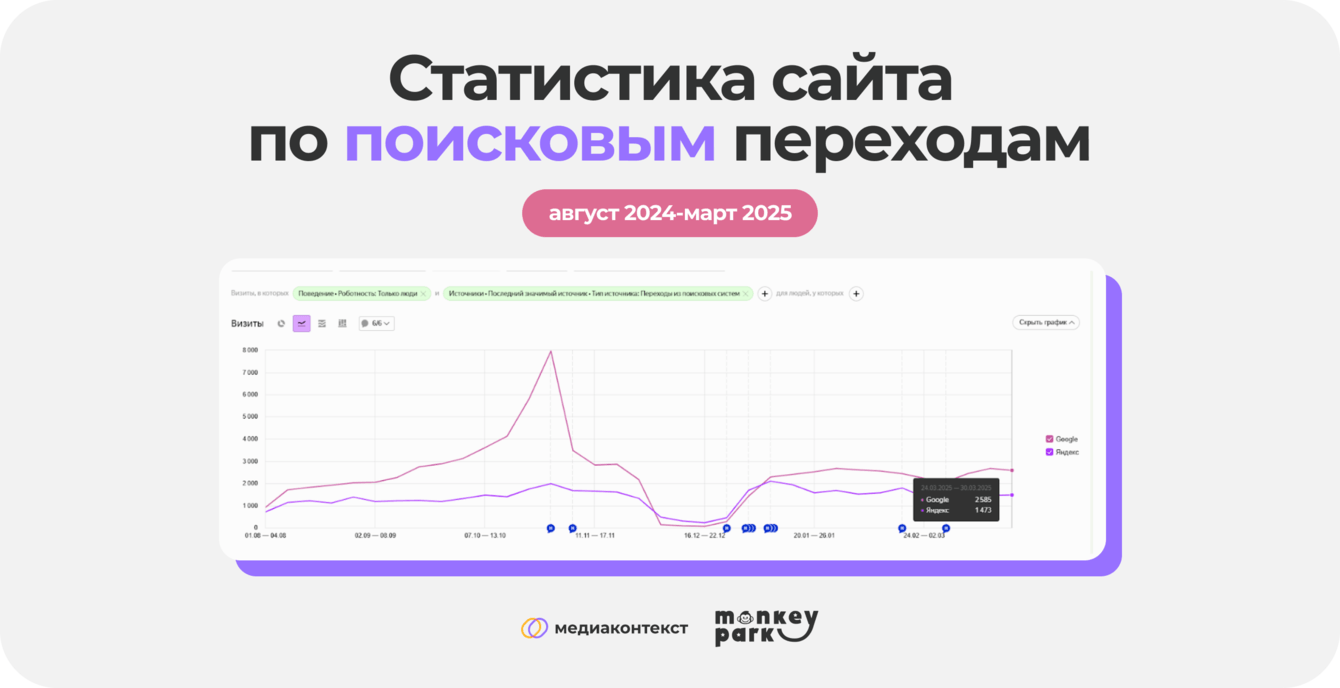 Согласно данным Яндекс Метрики за полгода еженедельный объем визитов из поисковых систем вырос более чем на 2 700 посещений. На долю Google приходится большая часть абсолютного прироста трафика.