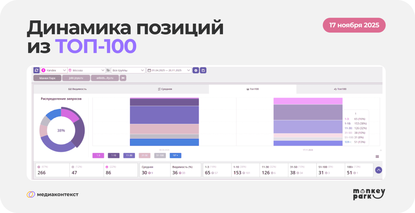 Виден четкий тренд: значительный рост в ТОП-10 сопровождается снижением доли запросов в позициях 11-30, 31-50 и 51-100. Это говорит о том, что многие запросы, которые раньше были во второй десятке или ниже, поднялись в ТОП-10. Это очень позитивная динамика.
