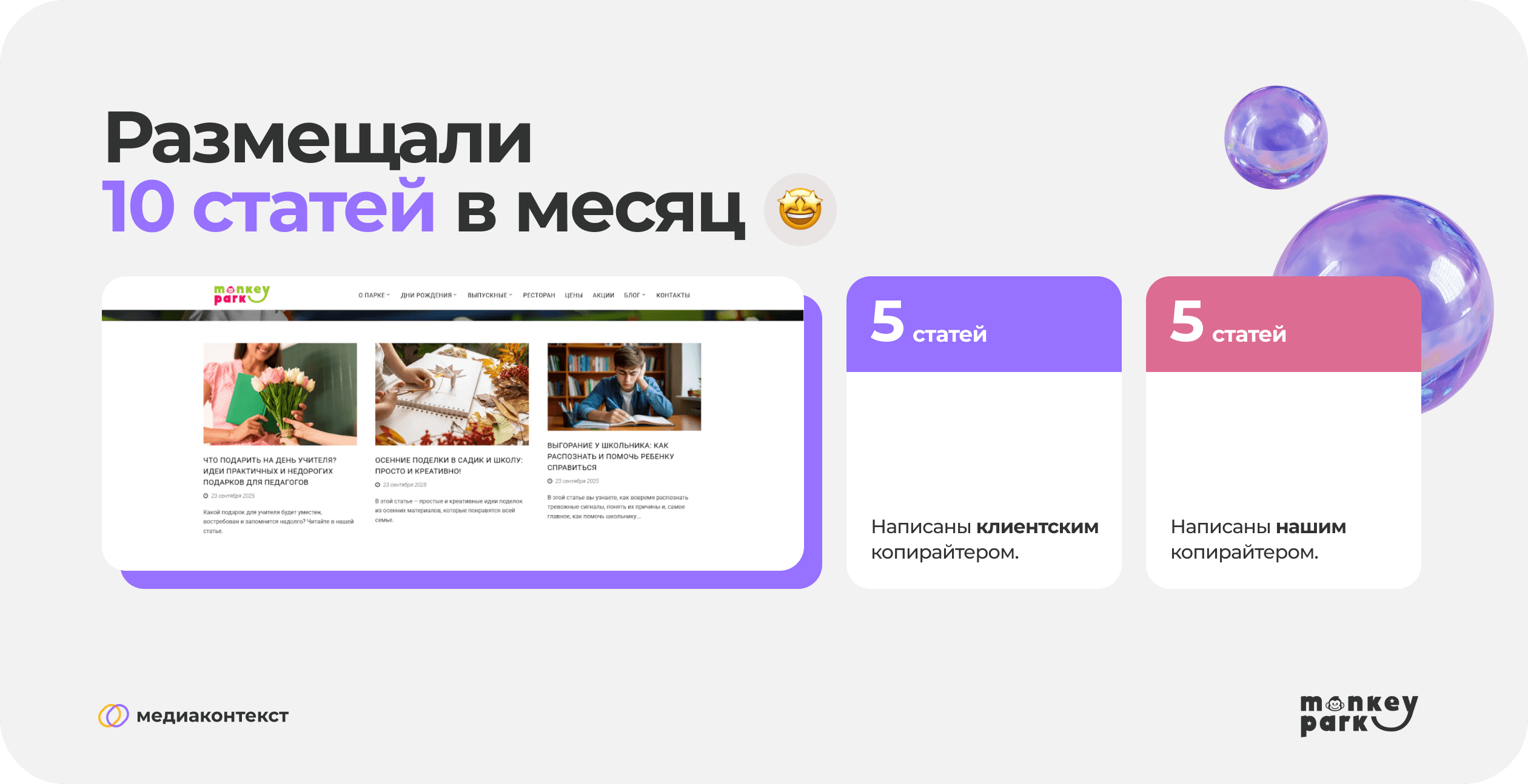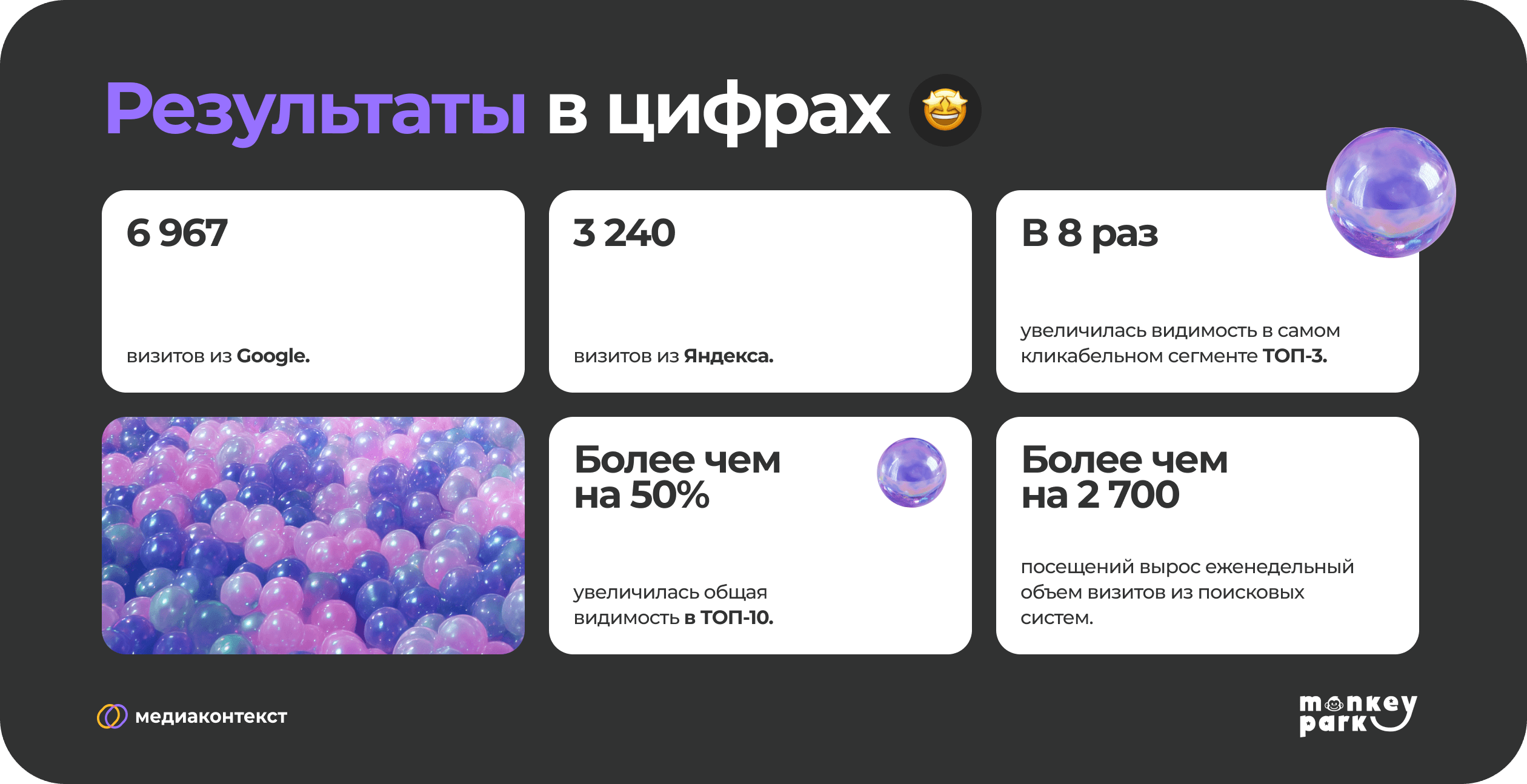 В апреле 2025 г. на поисковое продвижение в «Медиаконтекст» пришел детский развлекательный центр в Москве. Запрос клиента был не только на стандартные SEO-работы, но также на написание информационных статей в Блог на сайте.