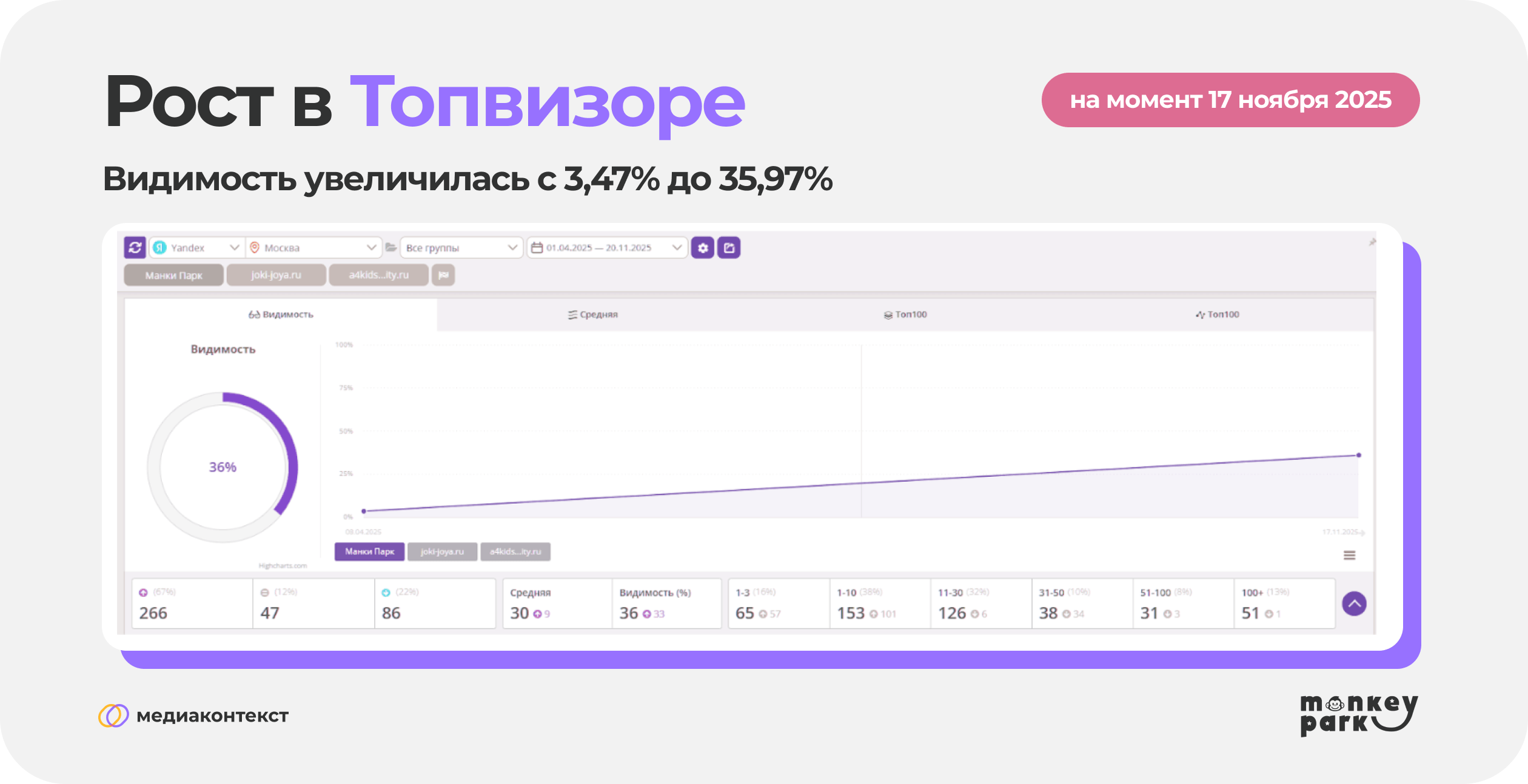 - Видимость в самом кликабельном сегменте (ТОП-1-3) увеличилась в 8 раз.