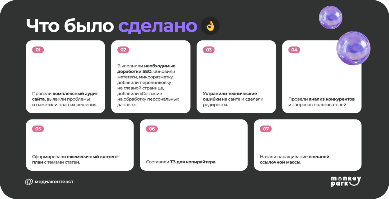 - Исправили технические ошибки в рамках SEO-оптимизации (настройка метатегов, редиректы, исправление микроразметки и т.д.);