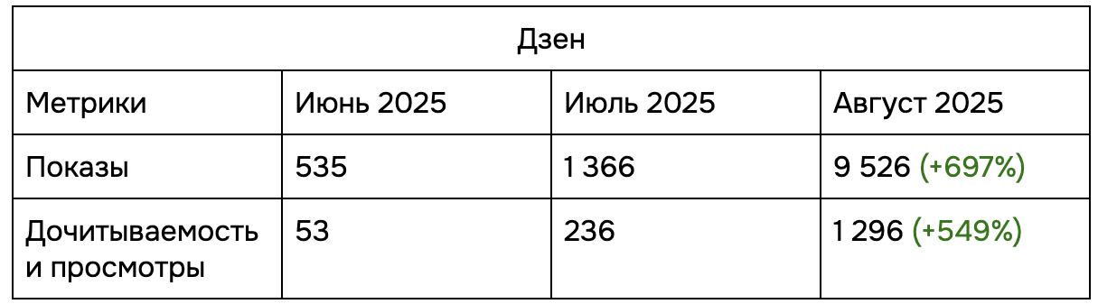 В Дзене органический трафик в июле составил всего 1 366 показов, а дочитывания и просмотры — 236. Контент не давал необходимого эффекта.