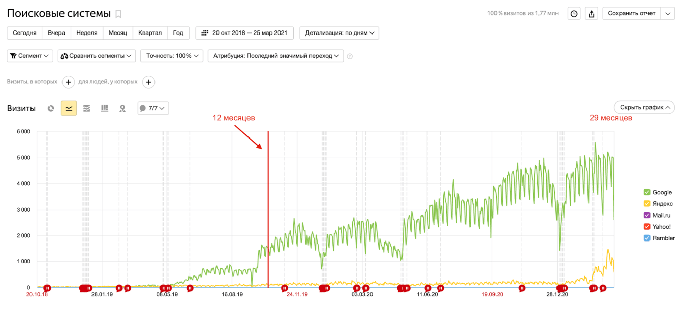 За первые 6 месяцев нам удалось увеличить посещаемость из поиска в 5 раз с 30 до 150 посетителей в сутки и улучшить видимость в 3 раза с 2 до 6%, а уже через год на сайт из поиска приходило в среднем по 1800 человек в сутки, видимость составляла 19%. Мы продолжаем работать с этим заказчиком, сейчас на сайте в среднем бывает по 6000 посетителей в сутки из поисковых систем и эта цифра продолжает расти. Видимость сайта 44%, 65% запросов из семантического ядра находятся в топ-10 — это результат совместной работы почти за 3,5 года.