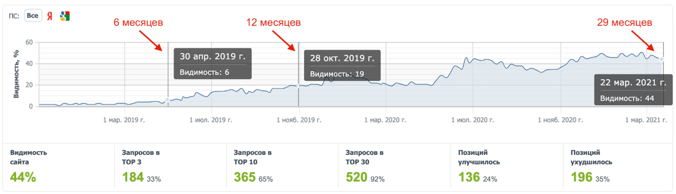 За первые 6 месяцев нам удалось увеличить посещаемость из поиска в 5 раз с 30 до 150 посетителей в сутки и улучшить видимость в 3 раза с 2 до 6%, а уже через год на сайт из поиска приходило в среднем по 1800 человек в сутки, видимость составляла 19%. Мы продолжаем работать с этим заказчиком, сейчас на сайте в среднем бывает по 6000 посетителей в сутки из поисковых систем и эта цифра продолжает расти. Видимость сайта 44%, 65% запросов из семантического ядра находятся в топ-10 — это результат совместной работы почти за 3,5 года.