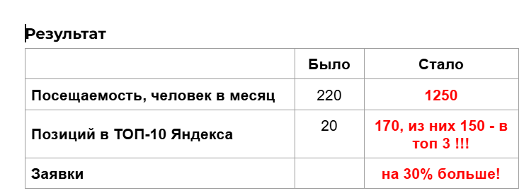 Получили рост посещаемости сайта - на момент старта было 240 посещений в месяц, сейчас - 1200.