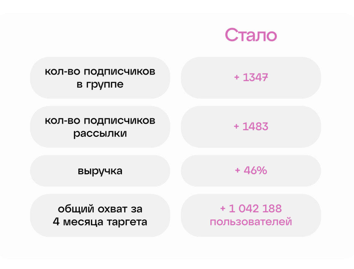 Придя к нам за таргетированной рекламой, основным запросом было увеличение среднего чека и привлечение новых покупателей. На тот момент их клиентопоток был нестабильным, а средний чек составлял всего 300–500 рублей. На поиск целевой аудитории и запуск таргета было мало времени, так как выручка нужна была срочно. Помимо этого, нам нужно было не просто набрать подписчиков в группу ВК, а привести реальных покупателей в магазин.
