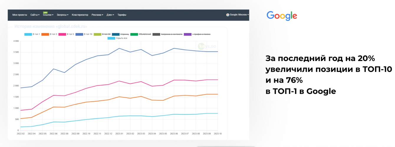 2. Определили перспективные запросы по приоритетным направлениям доставки - собрали более 3000 запросов, кластеризовали и провели скоринг. Выявили точки роста по созданию новых страниц