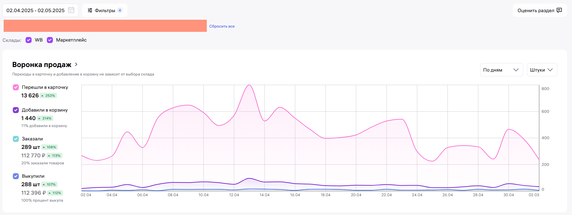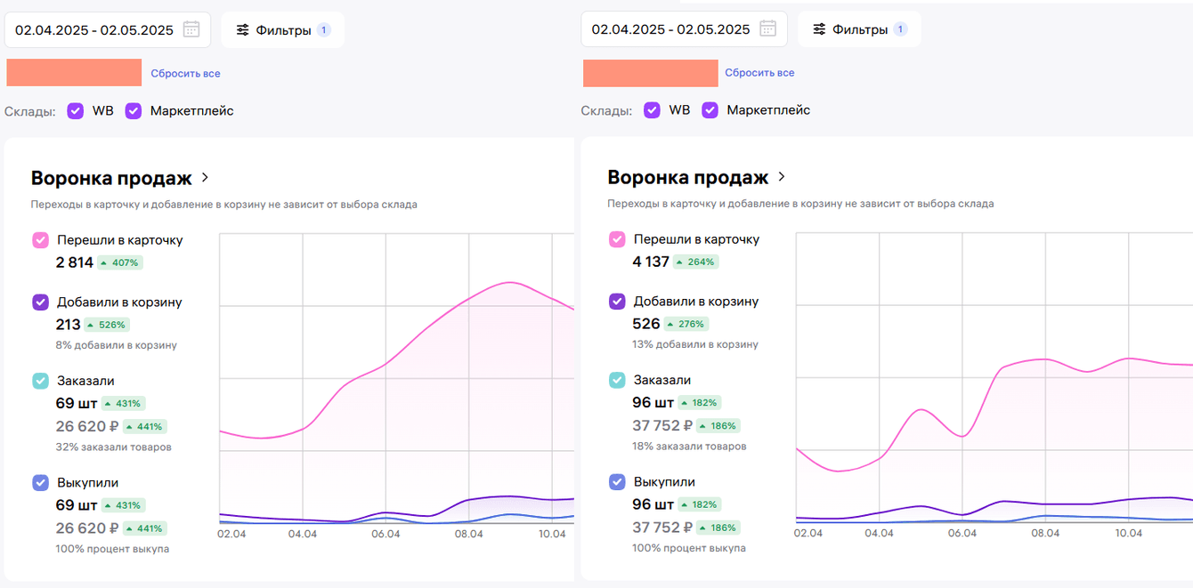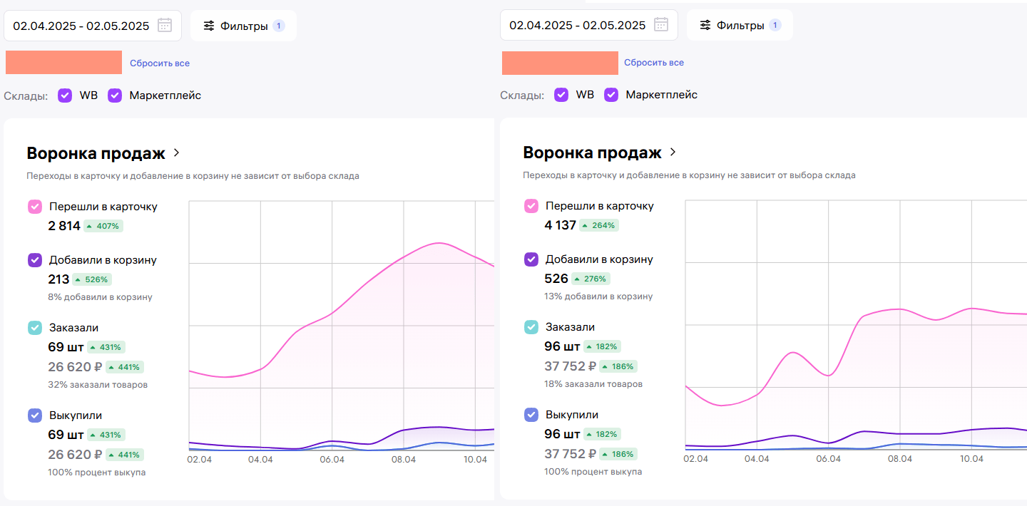 Работа велась по 4 карточкам в одной склейке. Старт пришёлся на пик по ключевым запросам — при отсутствии активных действий, спрос и выручка неминуемо пошли бы вниз. Мы сразу взялись за самое критичное, чтобы не упустить момент.