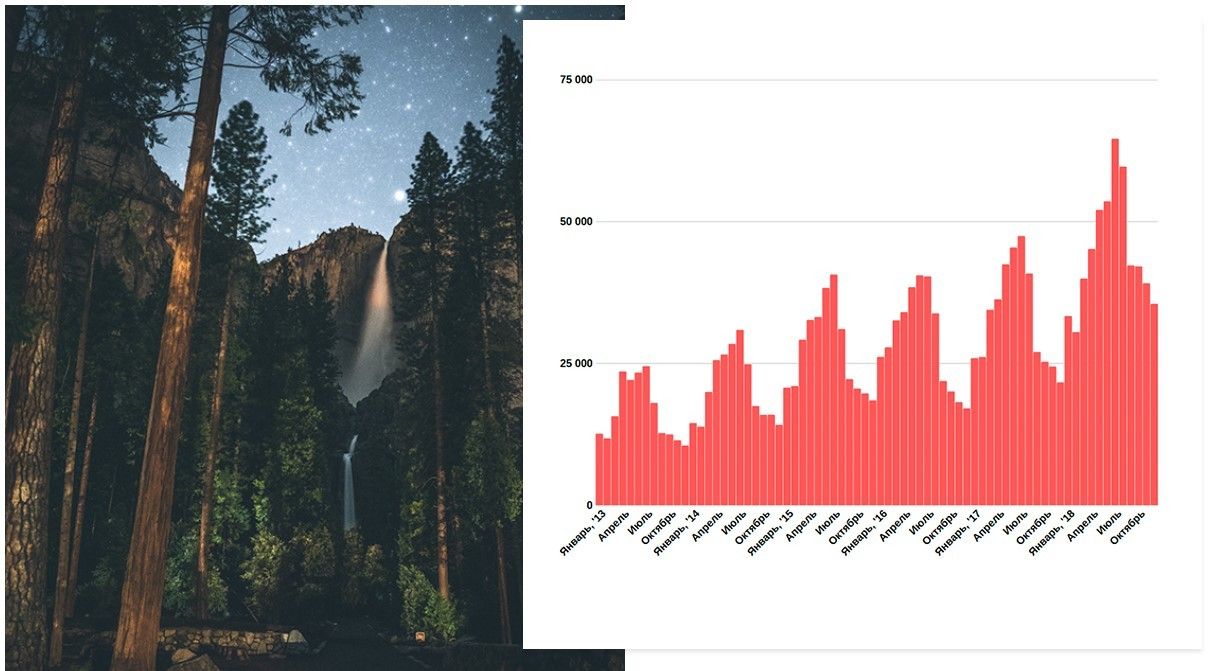 На текущий момент мы — ТОП-1 по видимости сайта. За первый год сотрудничества количество посетителей нашего сайта увеличилось в два раза. И затем количество переходов с поиска прирастало на 40000 пользователей каждый год.