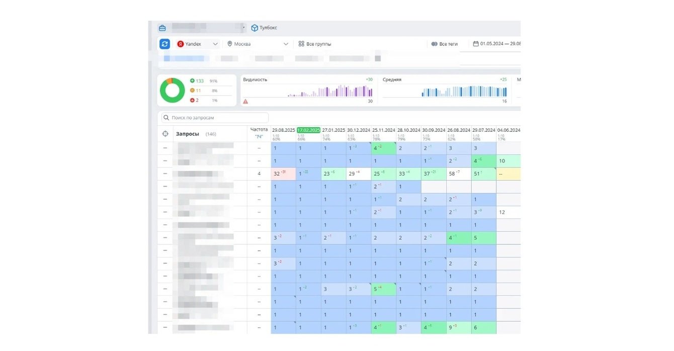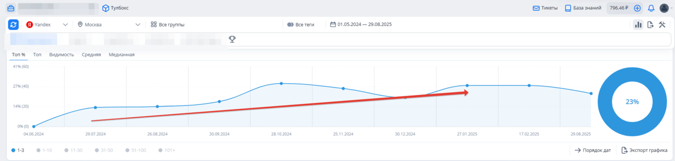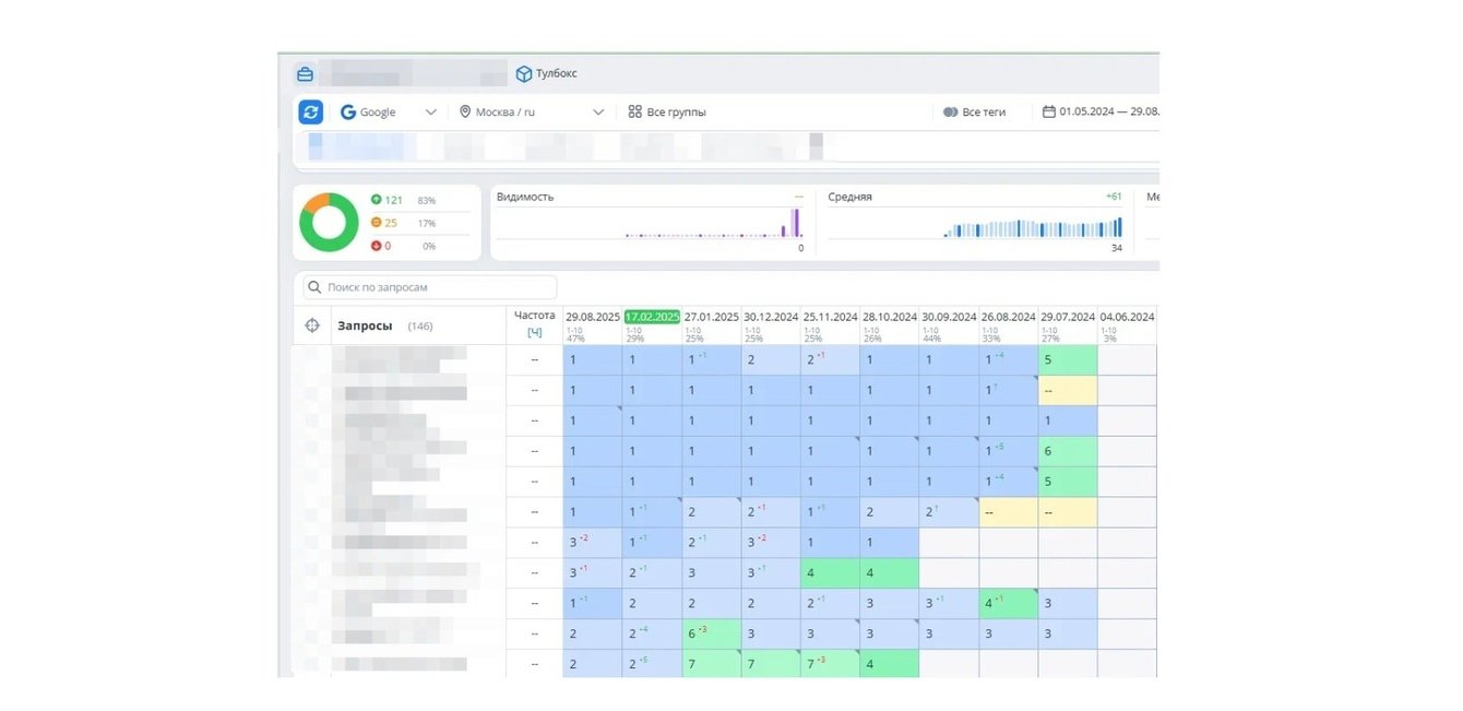 — После расширения СЯ до 150 запросов: процент в ТОП-10 остался примерно на том же уровне (60–70%), но количество продвигаемых запросов выросло втрое.