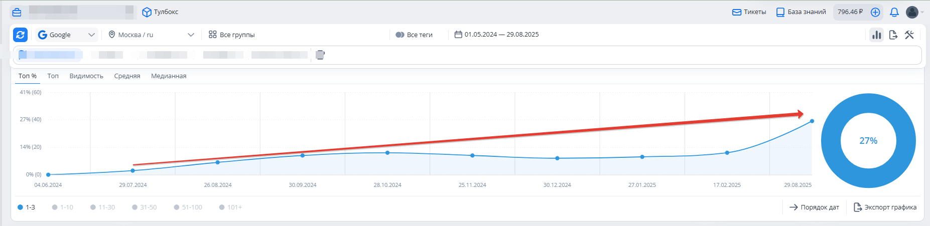— После расширения СЯ до 150 запросов: процент в ТОП-10 остался примерно на том же уровне (60–70%), но количество продвигаемых запросов выросло втрое.
