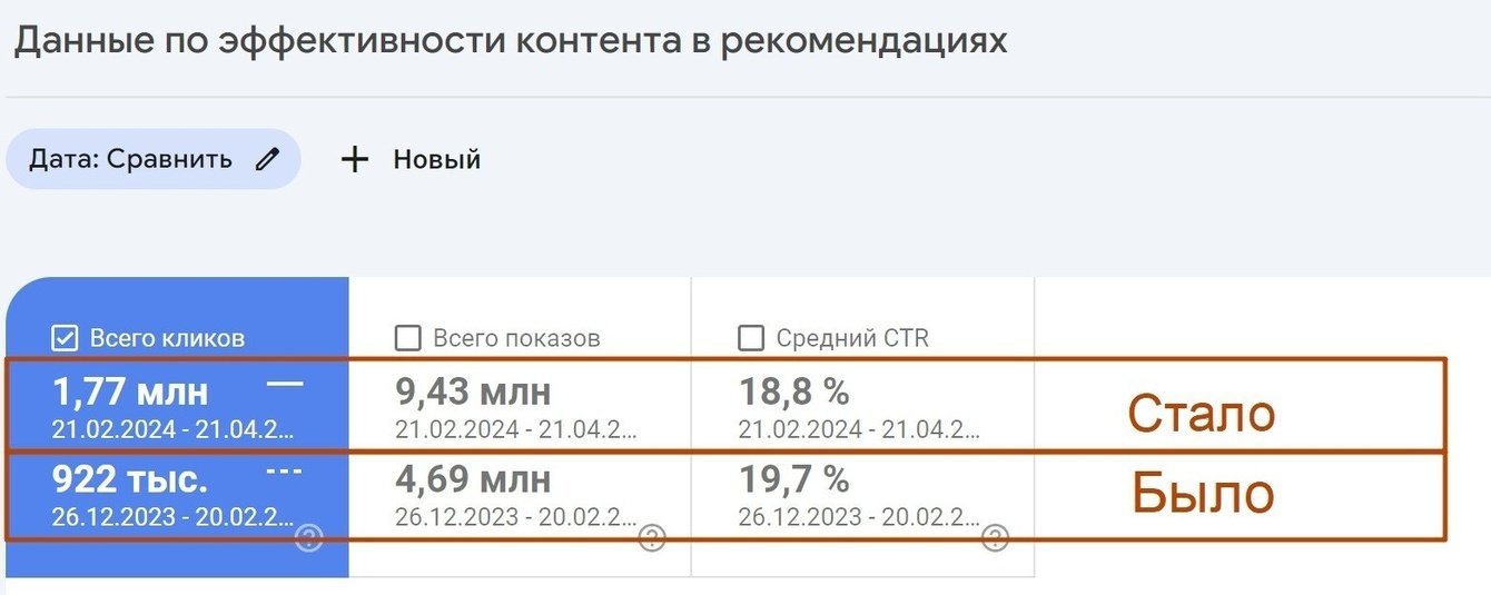 - Обновили статьи с учетом текущих трендов и требований Google, что позволило удвоить количество переходов из рекомендаций.