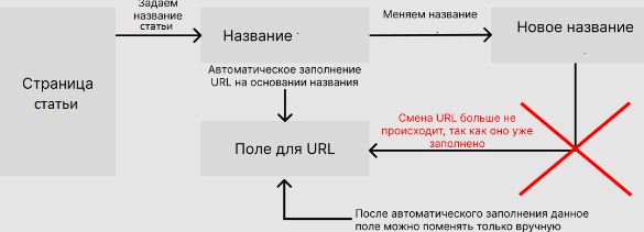Мы добавили статью на сайт, и поле URL автоматически заполняется на основании названия. Если решим поменять название статьи, URL не меняется, так как оно уже было заполнено и дальнейшие изменения данного поля возможны только вручную.
