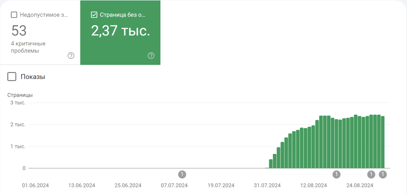 Один из первых шагов — массовая работа с шаблоном сайта. Мы обнаружили, что многие страницы имели дублирующиеся мета-теги и заголовки H1, что негативно влияло на ранжирование сайта в поисковых системах.