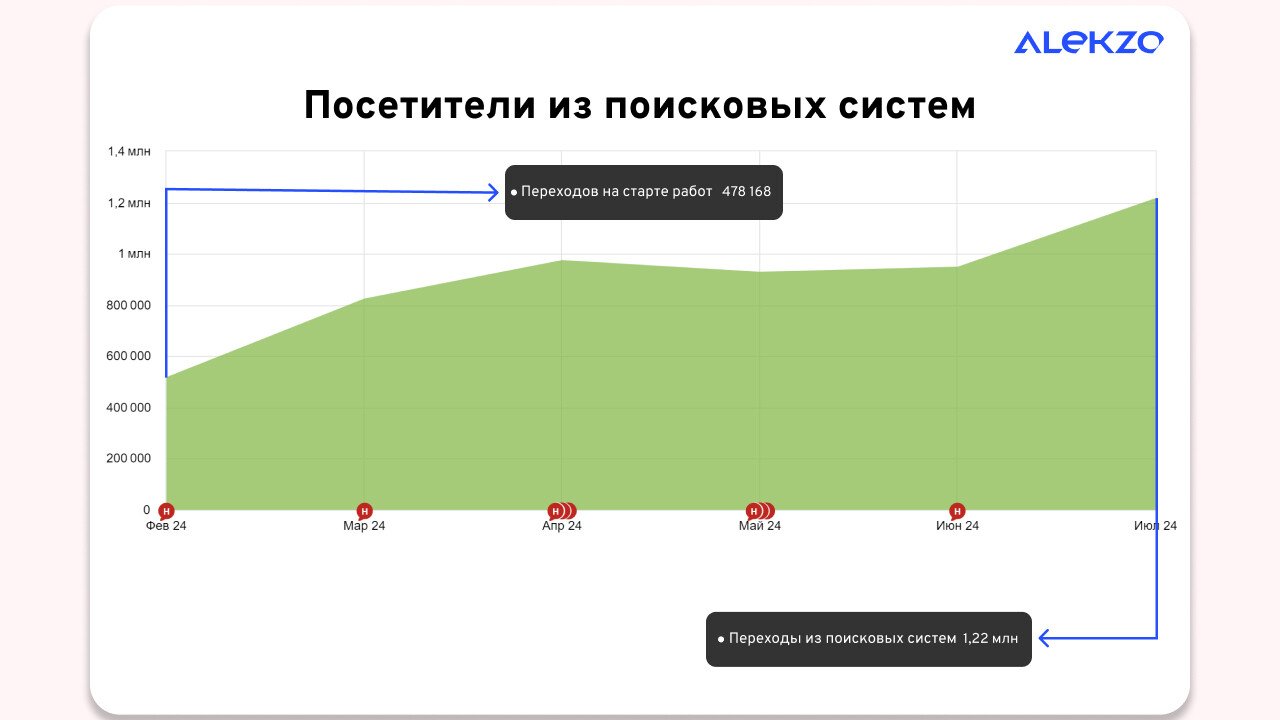 Этот кейс наглядно демонстрирует, как комплексный подход к SEO, включающий в себя техническую оптимизацию, улучшение контента и работу с юзабилити, может кардинально изменить положение сайта в поисковых системах и привести к значительному росту трафика. Мы выполнили около 40% всех запланированных работ, и даже этого оказалось достаточно, чтобы достигнуть целей клиента с запасом.