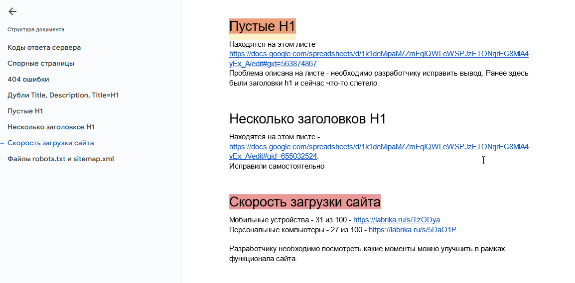 На основе проведенного технического аудита был сформирован подробный список задач для разработчиков сайта. В него вошли следующие пункты: