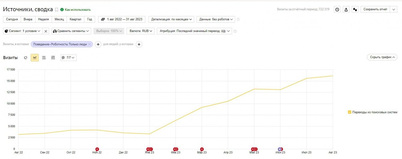 Одним из главных достижений стал существенный рост органического трафика на сайт. По данным Яндекс.Метрики, к контрольной точке в августе 2023 года количество посетителей из поисковых систем увеличилось с 3250 до 16250 в месяц. Это означает впечатляющий рост трафика на 400% по сравнению со стартовыми показателями.