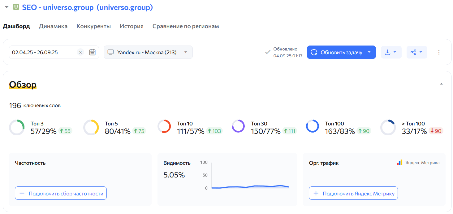 После выполнения всех ключевых этапов, результаты не заставили себя ждать. За время работы с сайтом Universo.group, трафик вырос более чем в 10 раз. Мы начали видеть позитивную динамику по позициям в поисковых системах. Более 60% целевых ключевых слов попало в топ-10, что означало, что страницы стали приносить органический трафик.