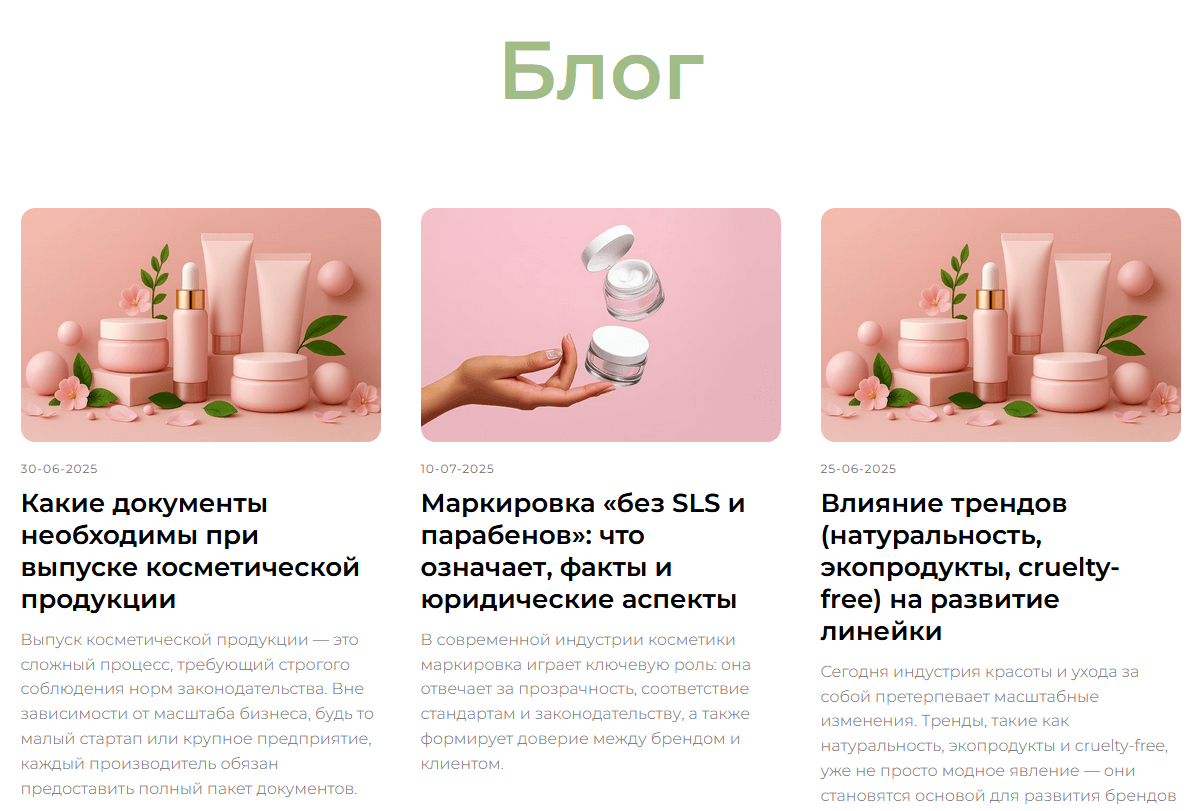 Статьи на блоге стали фокусироваться на полезных материалах для целевой аудитории: советы по уходу за кожей, последние тренды в косметике, особенности производства косметики под заказ и другие тематические статьи. Эти публикации помогали не только повысить общий вес сайта, но и раскрывали дополнительную семантику для поисковых систем.