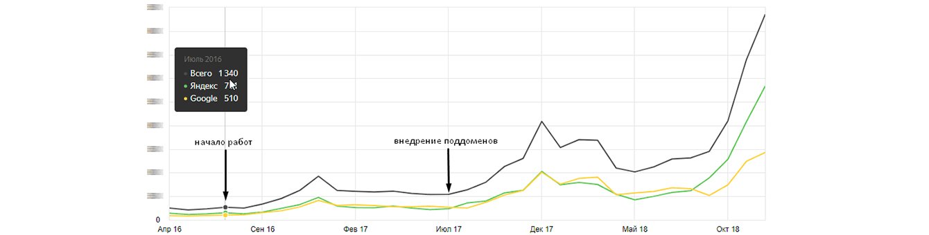 Внедрение поддоменов: создание, настройка, корректная «расклейка» в поисковиках с указанием главных зеркал и реализацией региональных вставок для каждого из доменов заняли около 3 мес и за следующий год мы получили прирост еще ≈ в 4 раза.