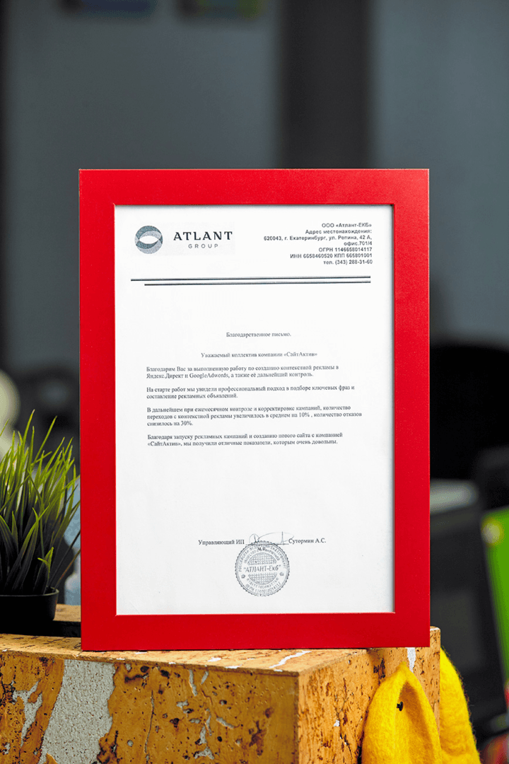 Благодарим вас за выполненную работу по созданию контекстной рекламы в Яндекс.Директ и Google AdWords, а также её дальнейший контроль.