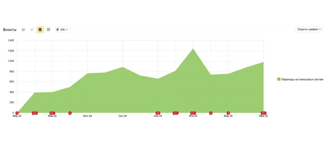 На начальном этапе были устранены технические ошибки сайта — убрали битые ссылки и изображения, доработали файлы robots.txt и sitemap.xml для устранения дублей в индексе поисковых систем. Настроили кабинеты вебмастера в Яндекс Вебмастер и Google Search Console, чтобы получать достоверные данные о ранжировании сайта. Затем приступили к системным работам над семантикой, контентом и внешней оптимизацией.