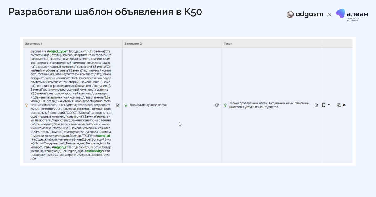 3. K50. Чтобы сфокусироваться на анализе данных и оптимизации рекламных кампаний, мы разработали систему объявлений. На уровне ключевых фраз сделали специальные шаблоны, которые позволяют выгрузить базовые ключевые фразы по объектам и быстро запустить по ним рекламу.