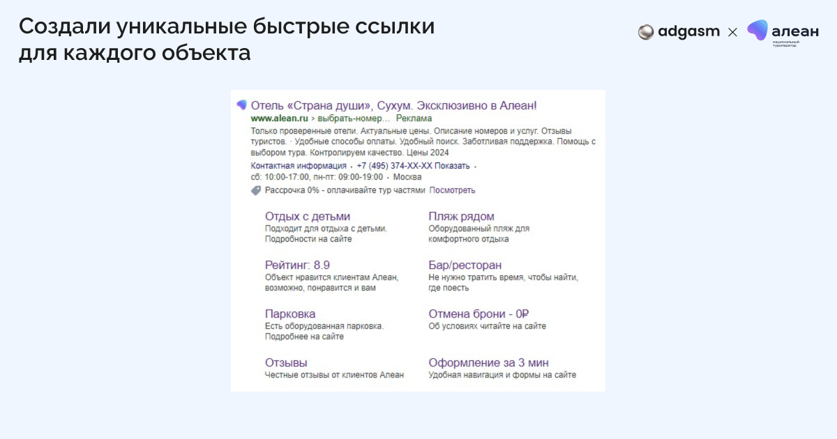 «Алеан» — это 60 регионов России, 9 000 отелей и 900 экскурсионных программ. Практически половина трафика с платной рекламы идёт напрямую на страницу объекта — санатория, отеля или тура. Принятие решения о бронировании происходит за 1–3 недели и через несколько касаний с продуктом.