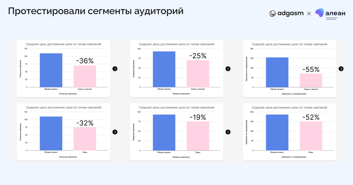 1. Mindbox. Используя интеграцию сайта «Алеан» с Mindbox, мы выявили самый эффективный сегмент аудитории — семьи с детьми. Усилив таргетинг на него, мы получили дополнительные бронирования на 35% дешевле.