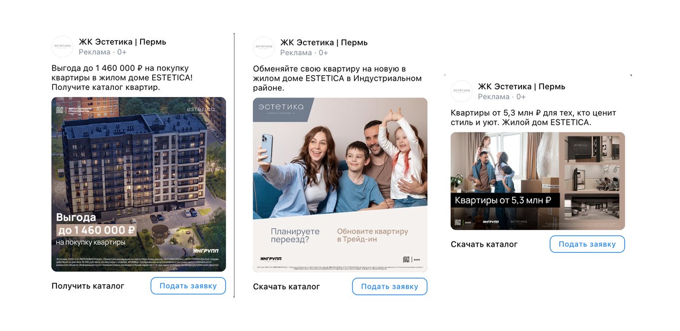 По умолчанию поиск аудитории длится 14 дней. Но в сфере недвижимости цикл принятия решений долгий, поэтому мы увеличили срок до 30 дней. Ограничения по возрасту выставили от 25 до 59 лет. Подготовили объявления, транслирующие преимущества жилого дома, выгодные программы и информацию о старте продаж.