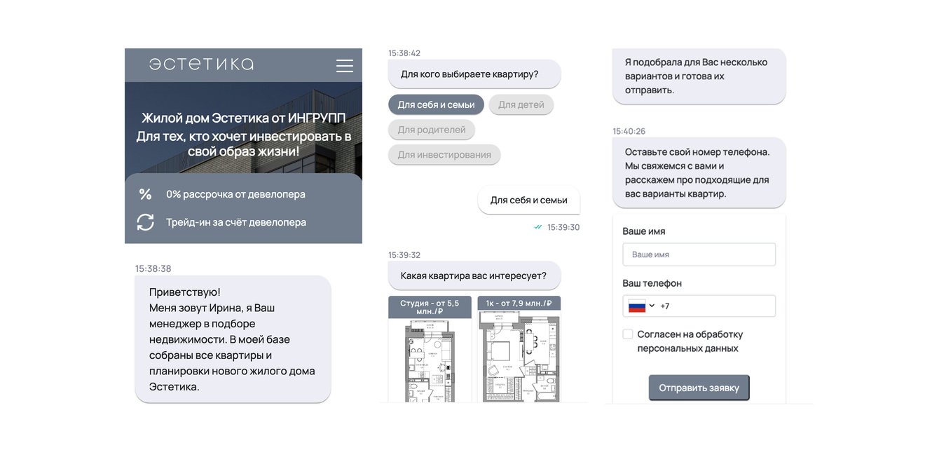 Чат-лендинг — страница интерактивного формата, которая работает как диалог с пользователем. Бот задает вопросы потенциальному клиенту о площади квартиры, интересе к ипотеке или рассрочке и других важных нюансах. После этого предлагает оставить контакты для связи.