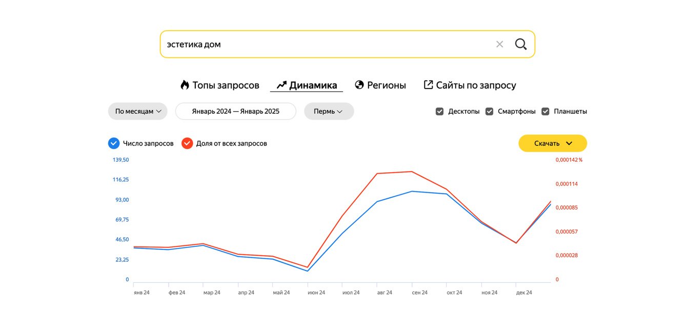 Активный старт онлайн-продвижения и влияние офлайн-каналов привели к росту числа поисковых запросов «эстетика дом». Показываем статистику по Яндексу (данные Вордстата):
