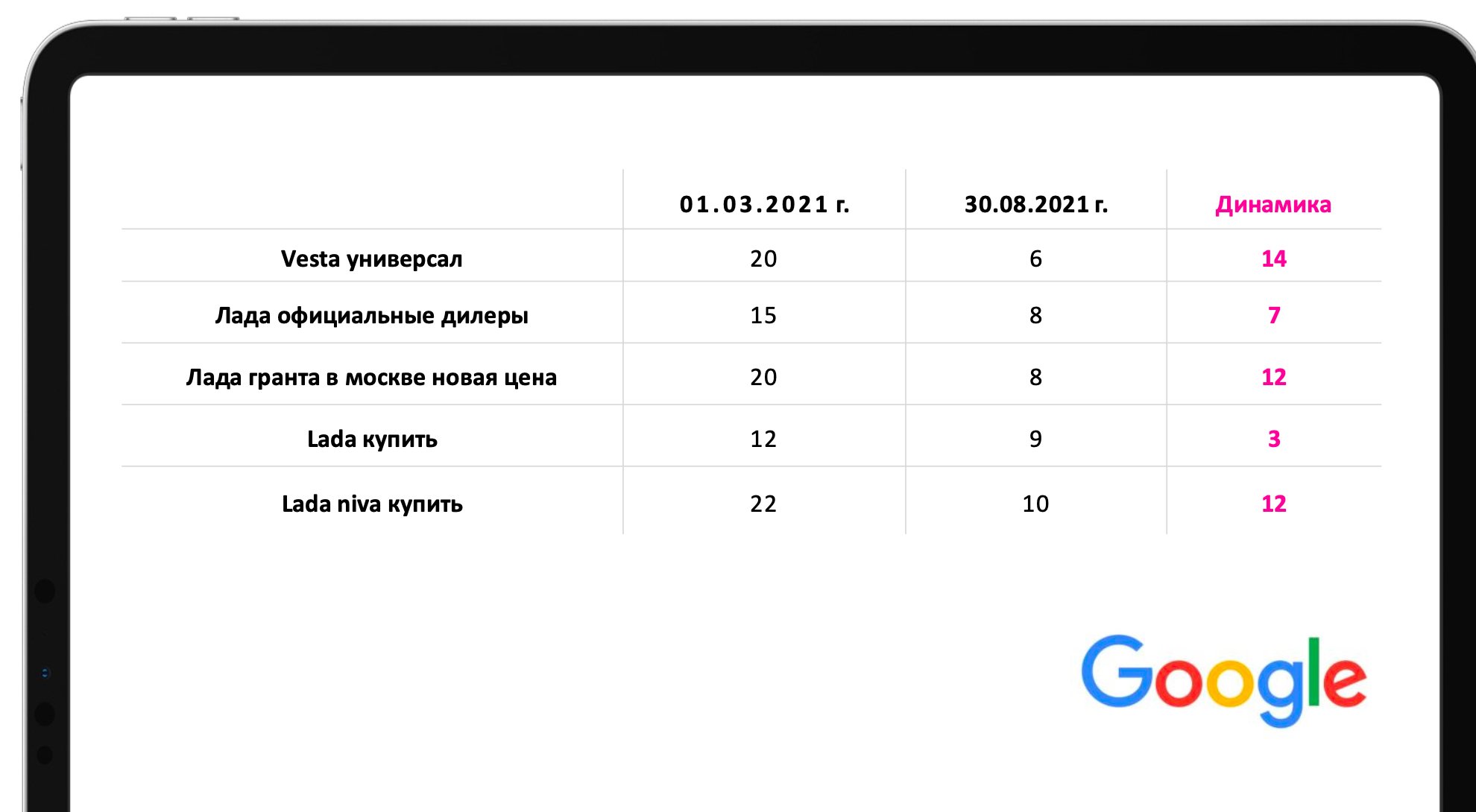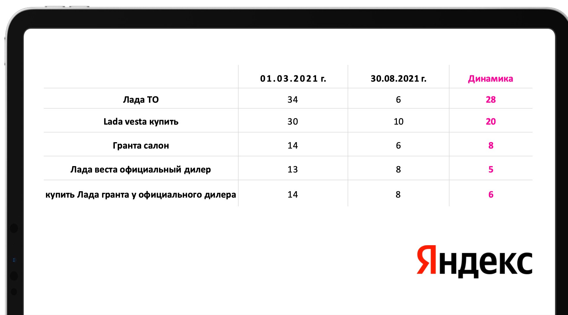 2. Достигнуты лидирующие позиции по высокочастотным, среднечастотным и низкочастотным поисковым запросам ниши, таким как «lada купить», «лада то», «лада официальные дилеры»«vesta универсал», «купить лада гранта у официального дилера» и т. д.