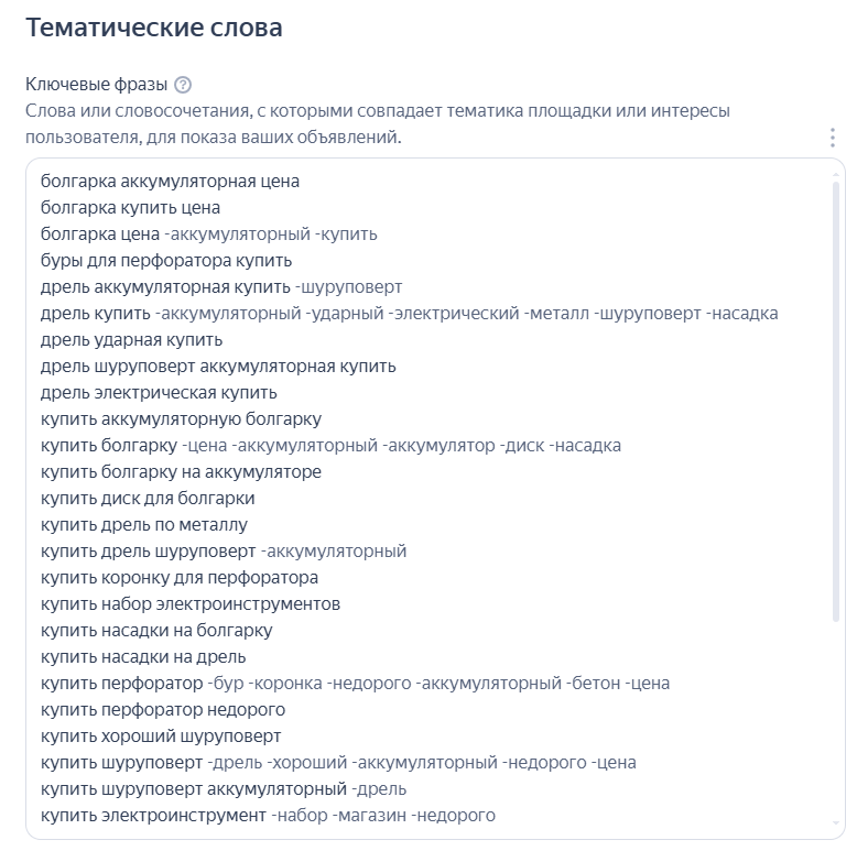 - Составили рабочую связку категорий, например: «дрель элетрическая купить», «болгарка купить цена» и другими.