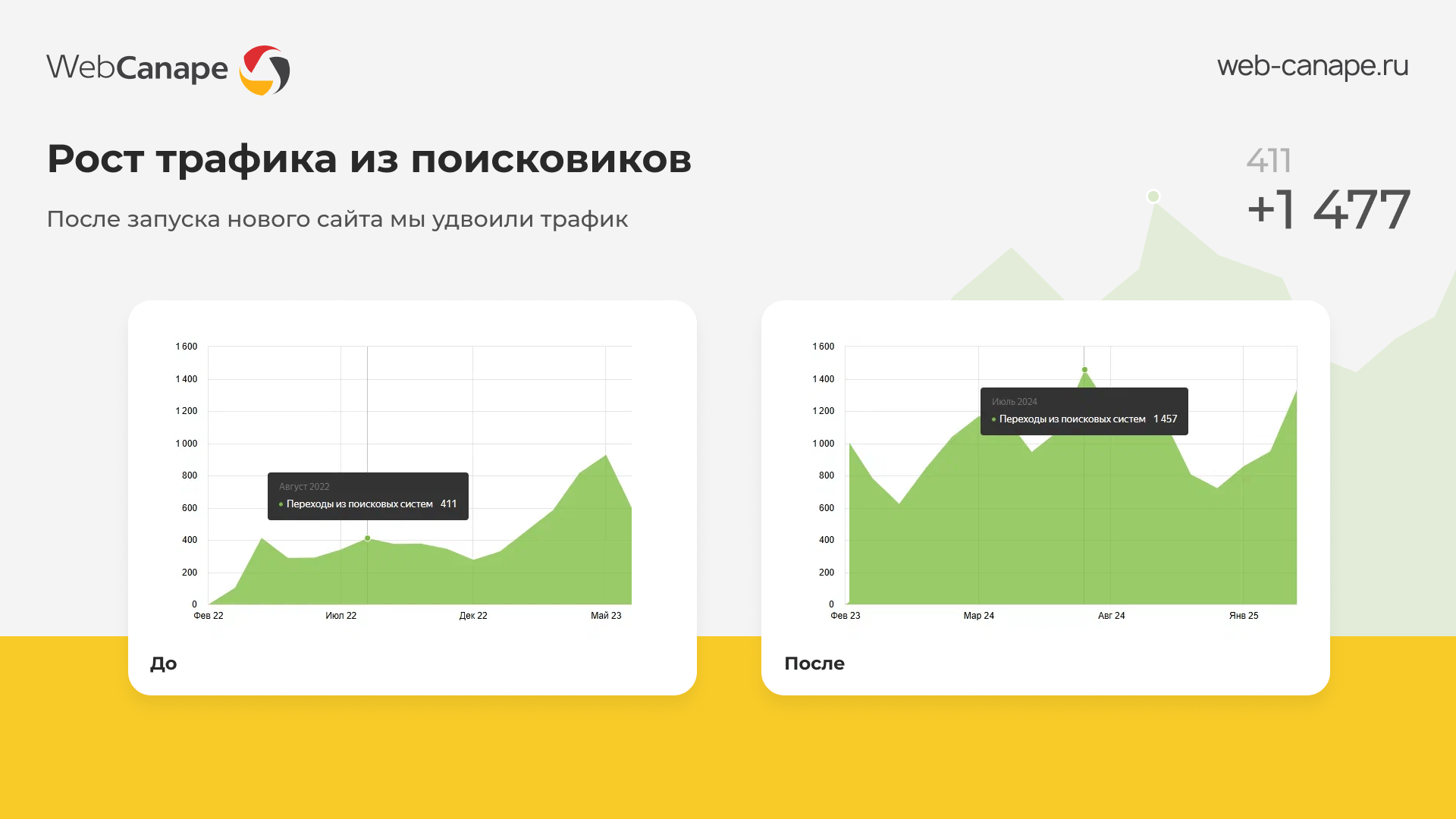 Старый сайт приводил до 500 посетителей в месяц и никакого роста клиент не наблюдал. После запуска нового сайта с учетом SEO-требований уже через несколько месяцев трафик начал уверенно расти.