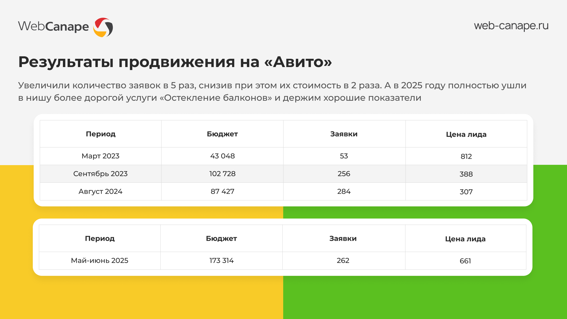 • Авито — увеличили количество заявок с 53 до 256 в месяц, снизив стоимость лида с 812 до 388 рублей.