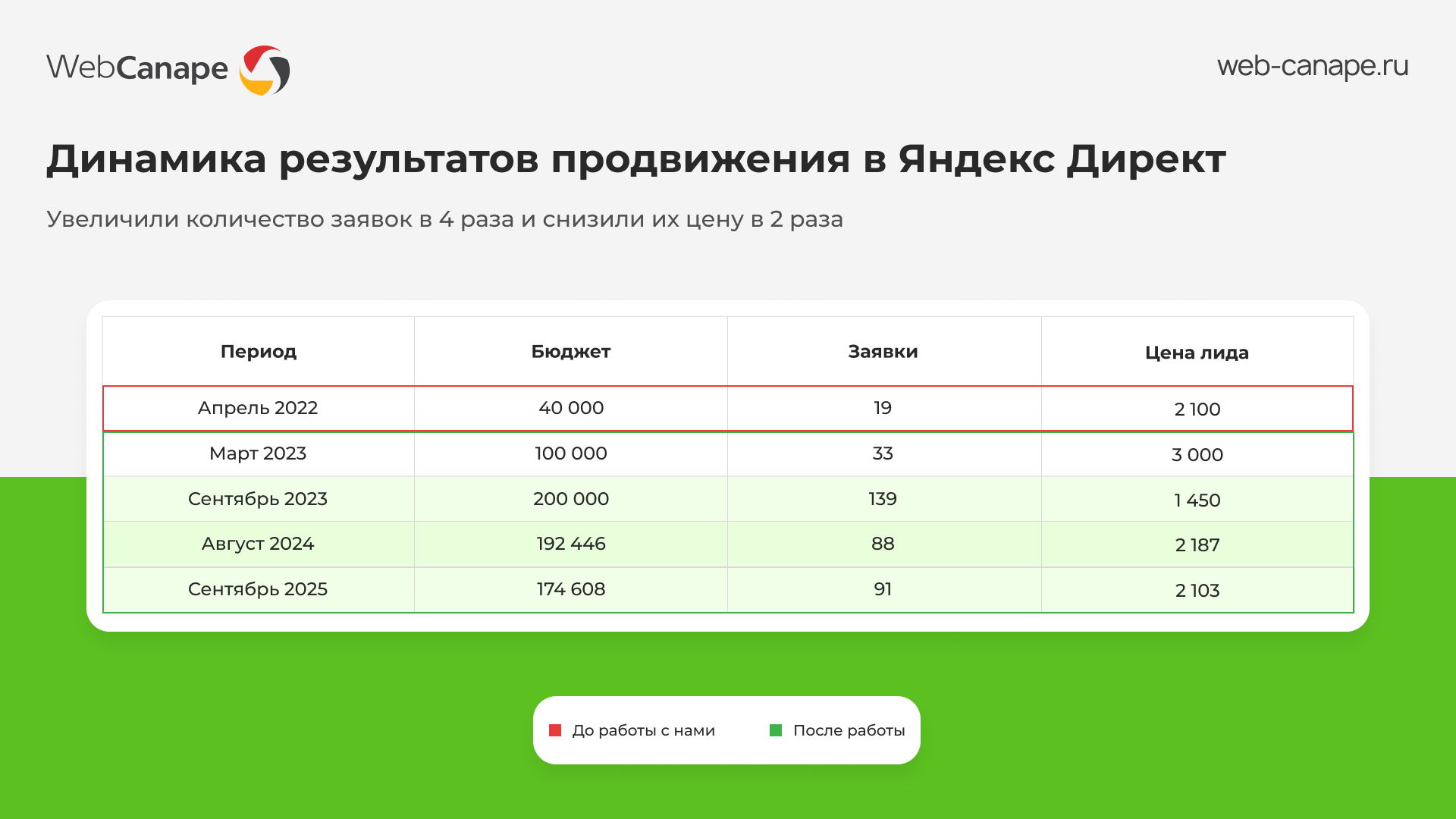 • Яндекс Директ — увеличили количество заявок с 33 до 139 в месяц, при этом снизили стоимость лида почти в 2 раза.