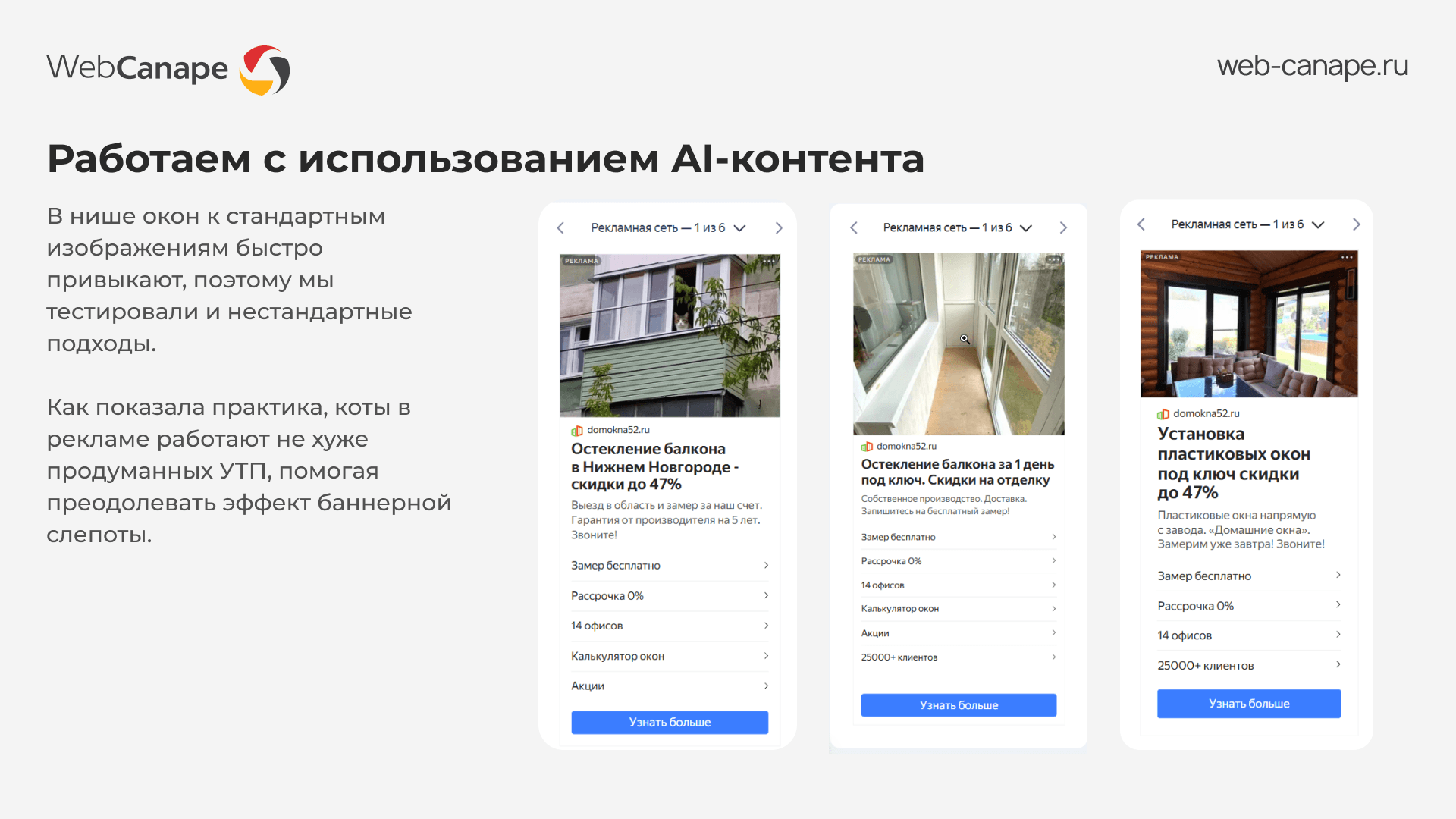 В нише окон к стандартным изображениям быстро привыкают, поэтому мы тестировали и нестандартные подходы. Как показала практика, коты в рекламе работают не хуже продуманных УТП, помогая преодолевать эффект баннерной слепоты.