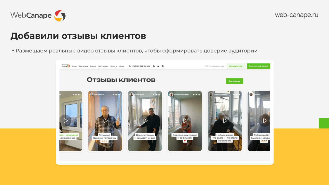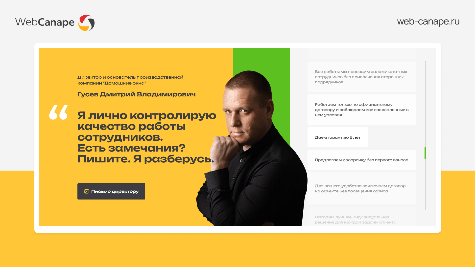 Прошлые агентства работали по универсальным шаблонам и не учитывали специфику оконного бизнеса: как принимается решение, какие факторы влияют на выбор, какие элементы на сайте действительно повышают конверсию.