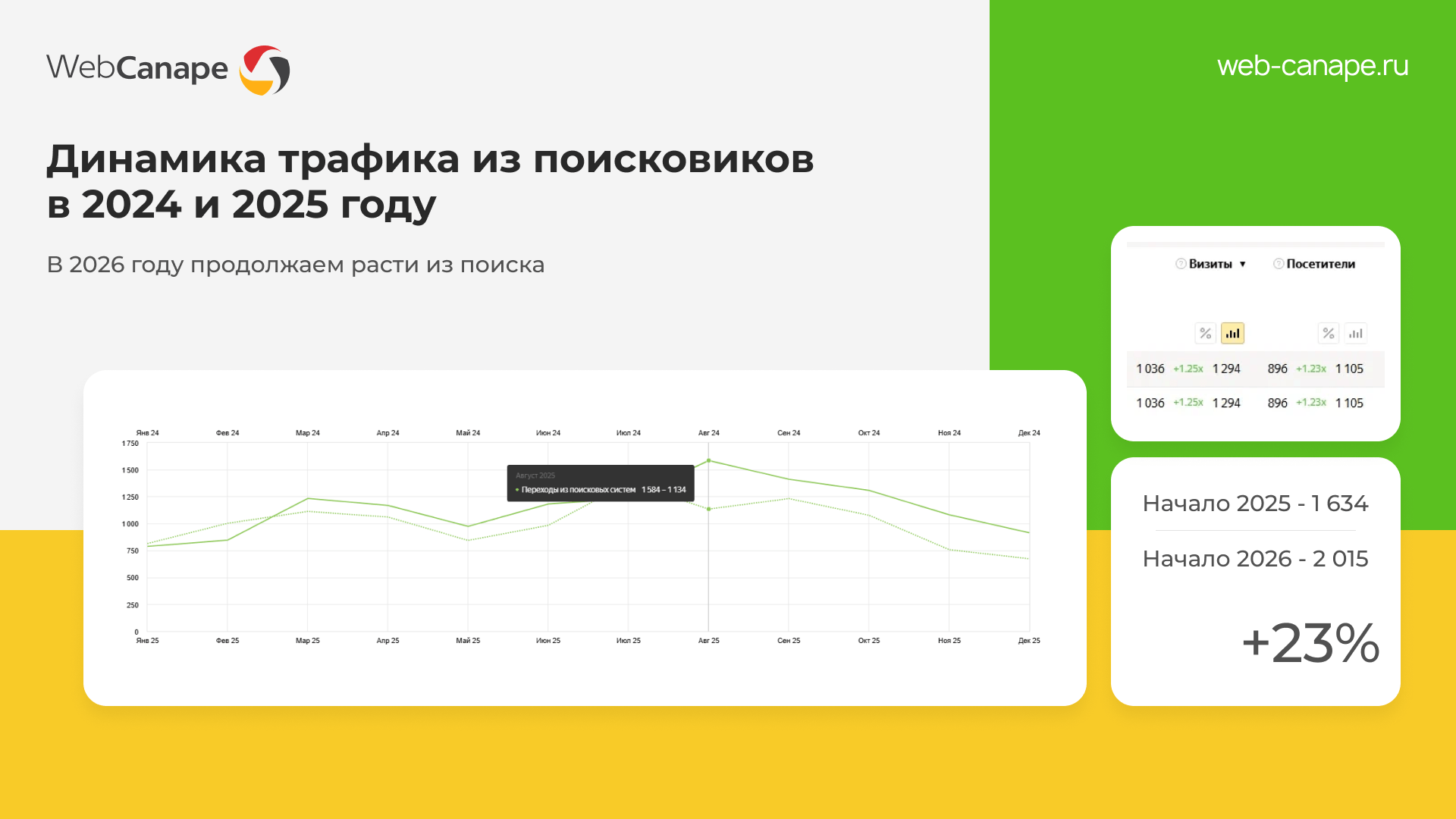 Мы не просто увеличили трафик, но и закрепили результат. Даже после выхода на стабильный уровень количество визитов продолжает расти — по сравнению с началом 2025 года органический трафик увеличился еще на 23%.
