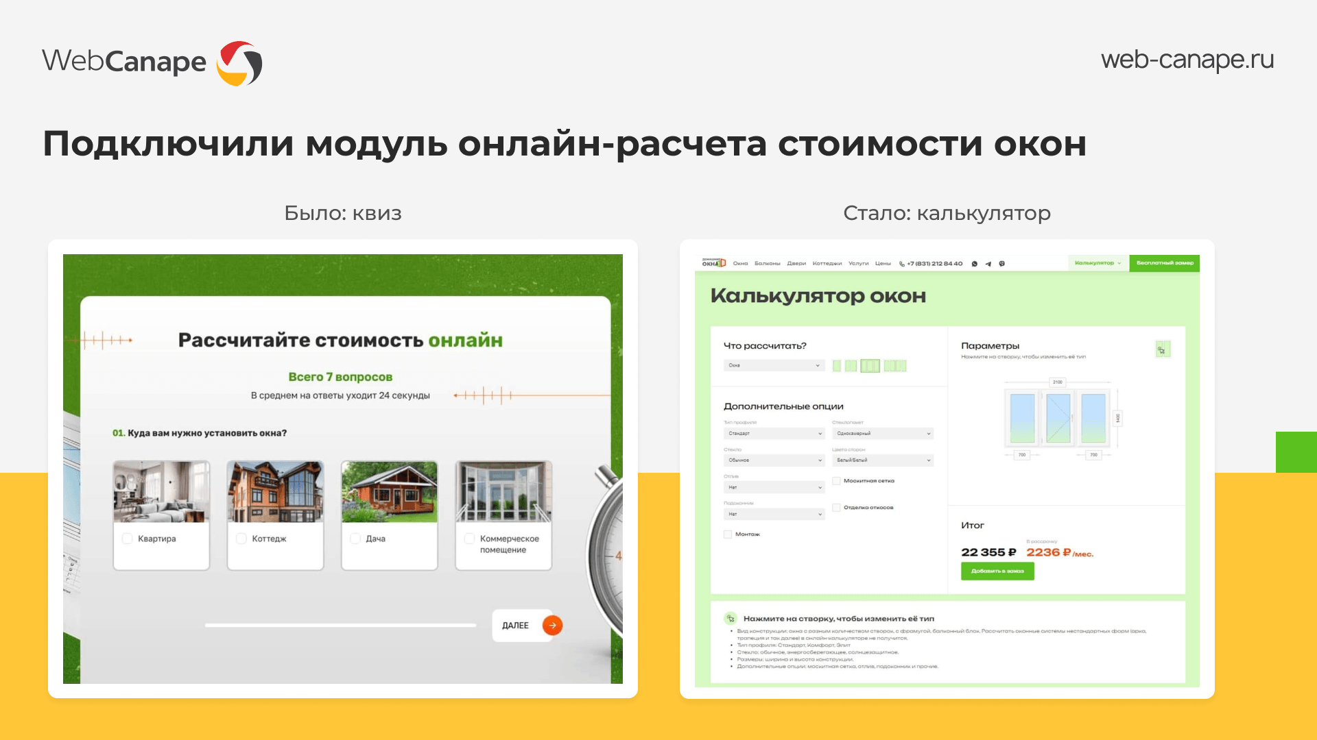Ранее на сайте был квиз, который не давал реального расчета. После внедрения калькулятора пользователь сразу получает ориентировочную стоимость — зачастую это снижает барьер для обращения.