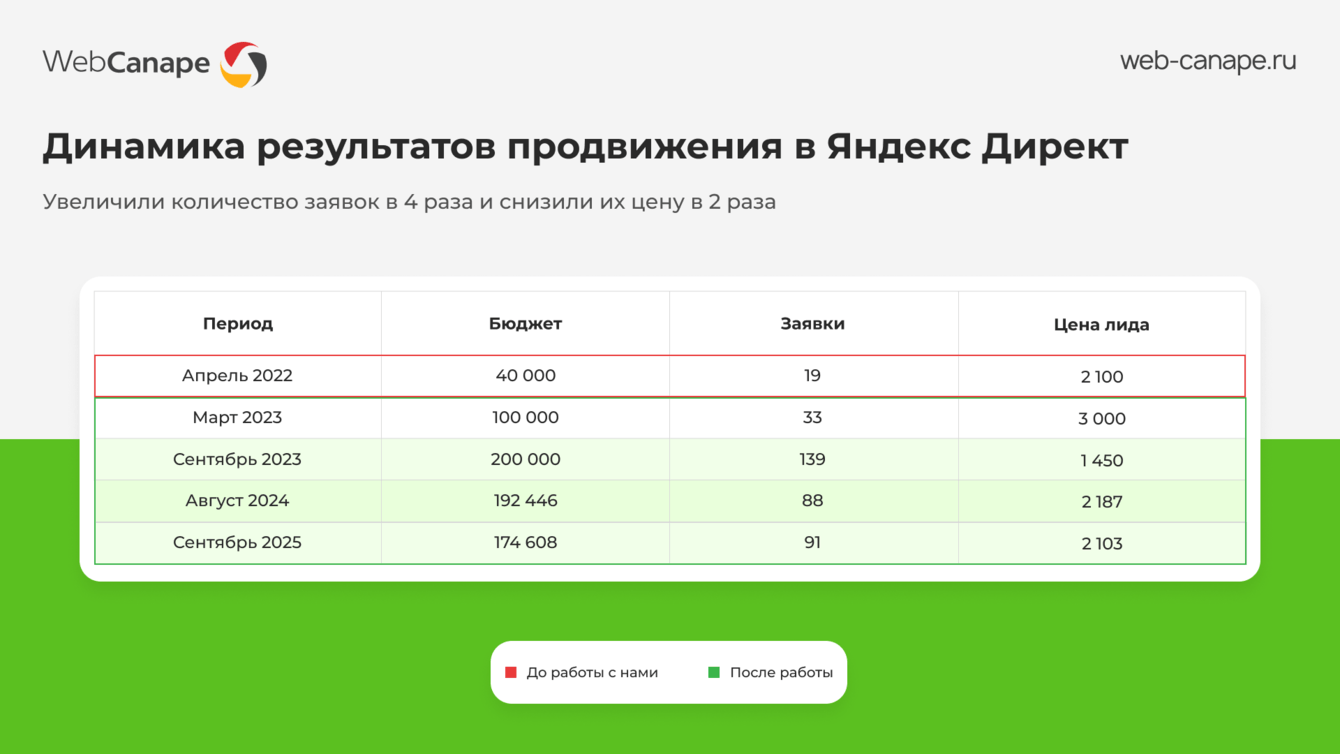 Наша стратегия доказала свою эффективность не только в период роста. Даже в условиях снижения спроса и кризиса нам удалось сохранить стабильный поток заявок для клиента, а с учетом роста SEO — обеспечить увеличение общего объема обращений.
