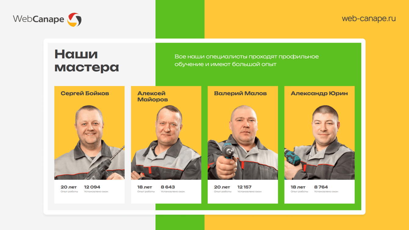 Чтобы снять основной страх — «сделают плохо и пропадут» — мы сделали акцент на открытости компании. Показали руководителя и мастеров, добавили информацию об опыте сотрудников, использовали реальные фото команды и процессов.