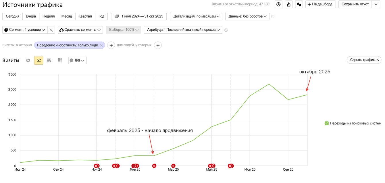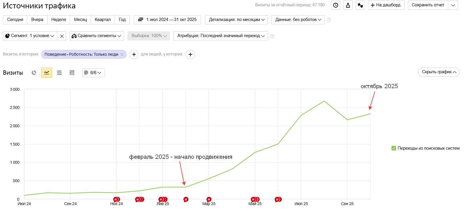 Органический трафик увеличился в 7 раз — с 325 визитов в феврале 2025 до 2 337 визитов в октябре 2025.