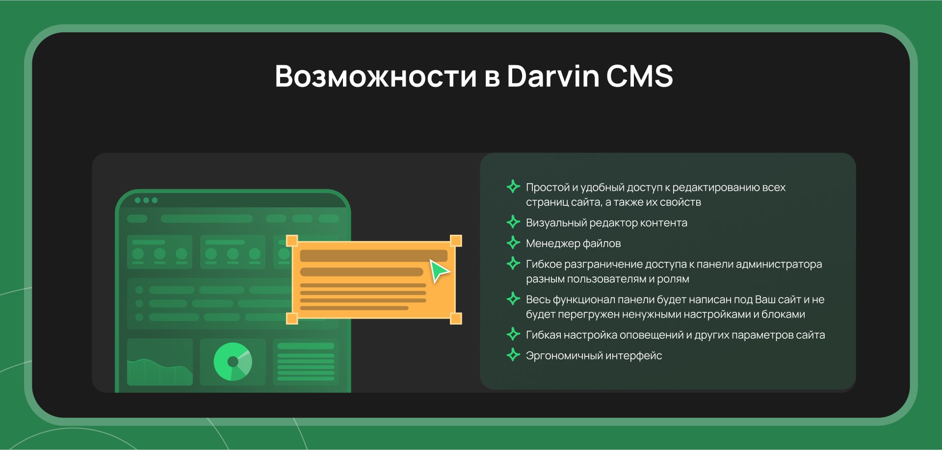 Сайт получился удобным не только для пользователя. В Darvin Digital – это рабочий инструмент, с которым постоянно взаимодействует команда: маркетологи, копирайтеры, оптимизаторы. Поэтому уже на этапе разработки мы заложили важные «плюшки» для своих, чтобы после запуска не приходилось лезть в код ради правки блока или добавления новой услуги.