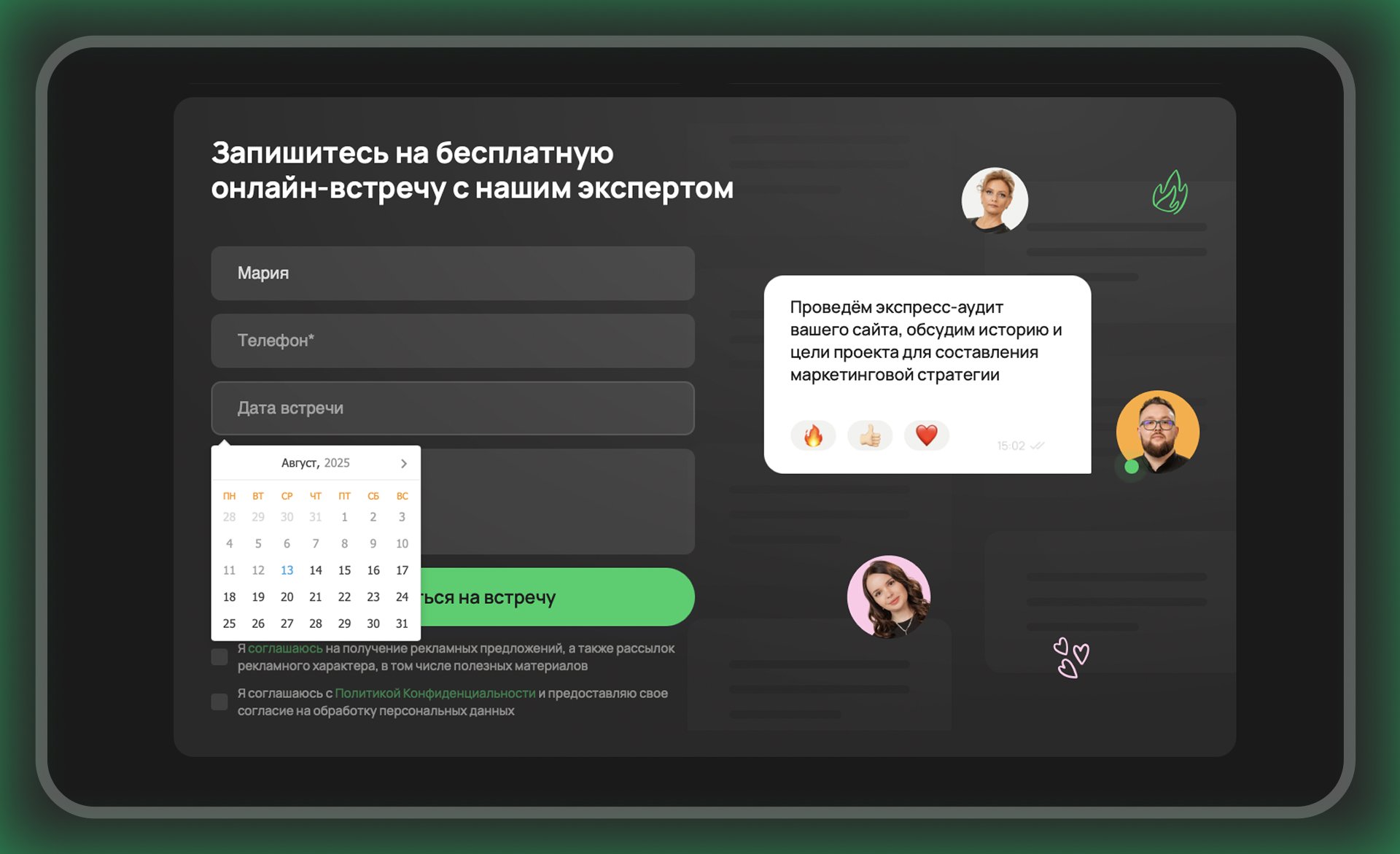 Сделали формы под разные сценарии: от «обратного звонка» до скачивания лид-магнитов. И, конечно, тестировали. Проверяли всё: от поведения форм до работы калькулятора, от навигации до отображения кейсов. Искали не только баги, а что можно улучшить.