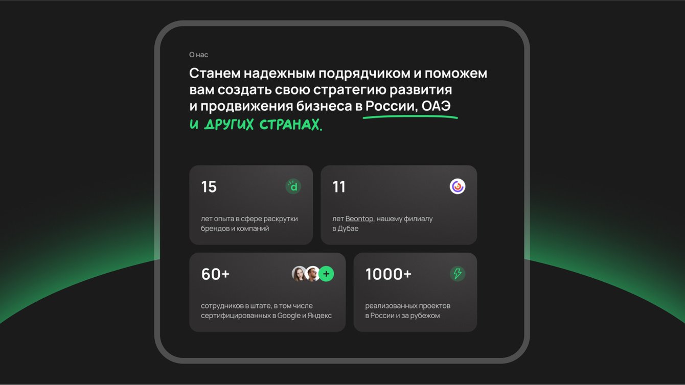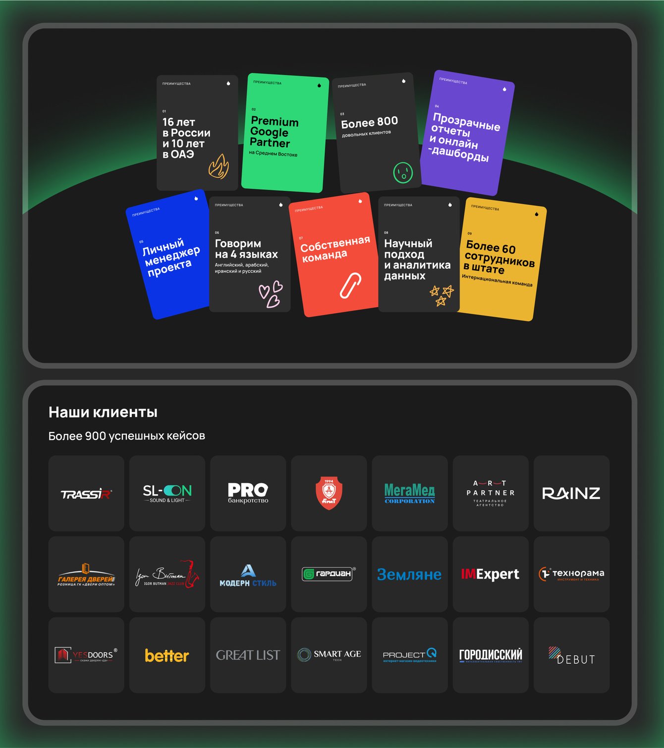 Новый дизайн сделал сайт проще и сильнее одновременно. Проще, потому что убрали лишнее, оставив только нужный контент и понятные призывы к действию. Сильнее, потому что визуально теперь всё выдержано в едином современном стиле, который выделяет нас среди конкурентов. Тёмный минимализм сыграл на руку: важные акценты сразу бросаются в глаза, фото и кейсы смотрятся эффектно на тёмном фоне. Анимации и интерактивные элементы появились там, где это улучшает восприятие, но не отвлекает от главного. Сайт стал отражать наш профессионализм и перфекционизм.