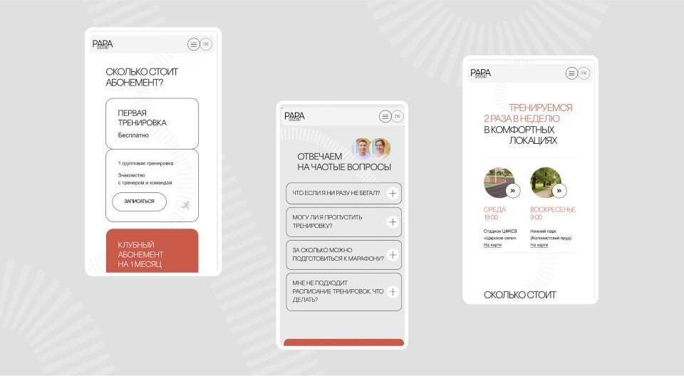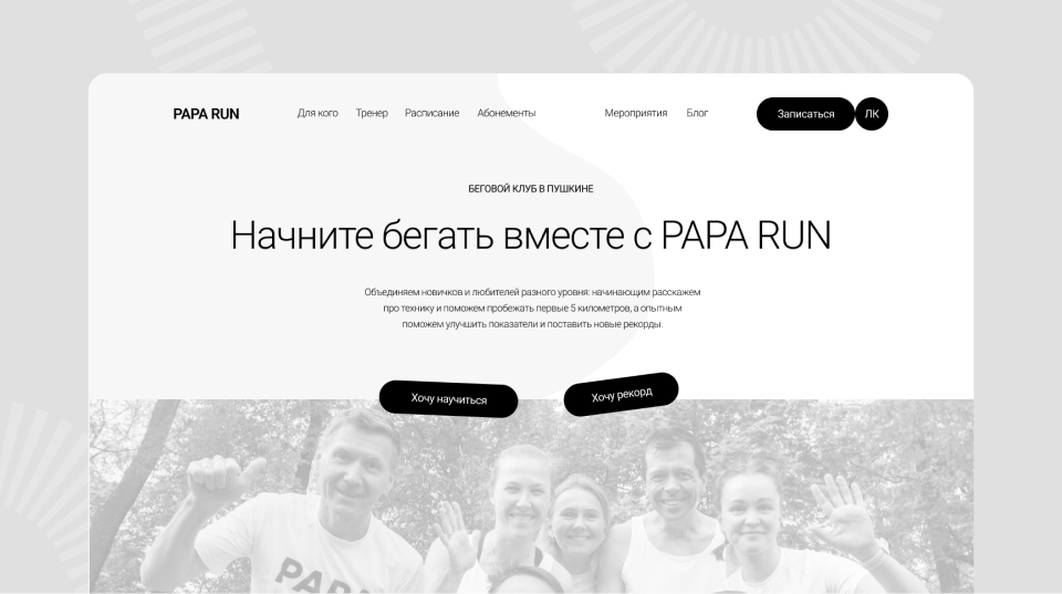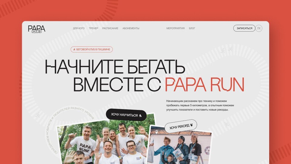 К нам обратилась Анна, соосновательница Бегового клуба ПапаРан с запросом на редизайн существующего сайта клуба. Сайт хотелось сделать более современным и конкурентоспособным. Главная бизнес-задача — привлечь в клуб новых спортсменов и увеличить размеры тренировочных групп.
