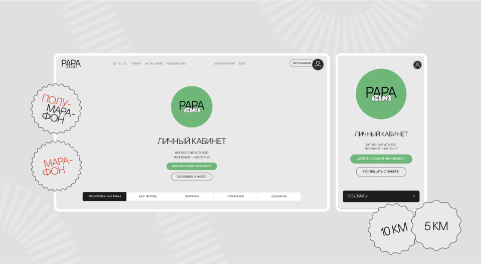Внутри сайта «прячется» личный кабинет для спортсменов. После покупки абонемента каждый участник регистрируется в ЛК, где может отслеживать свой прогресс и скачивать личный план тренировок на неделю. Мы переработали структуру существующего ЛК, адаптировали его для мобильного телефона.
